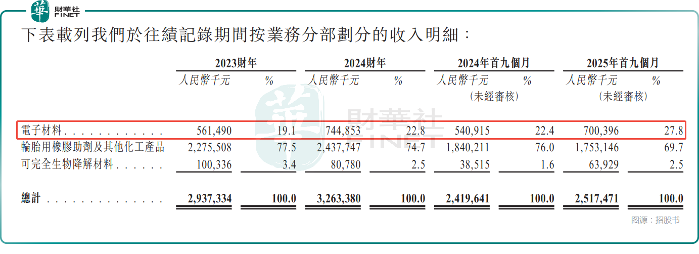 不難發現,電子材料業務增長迅猛,已成為核心增長引擎,而輪胎用橡膠助劑及其他化工產品作為傳統核心業務,仍保持穩固的市場份額,整體收入結構既依託成熟業務保障基本盤,又有高增長業務拉動增量。