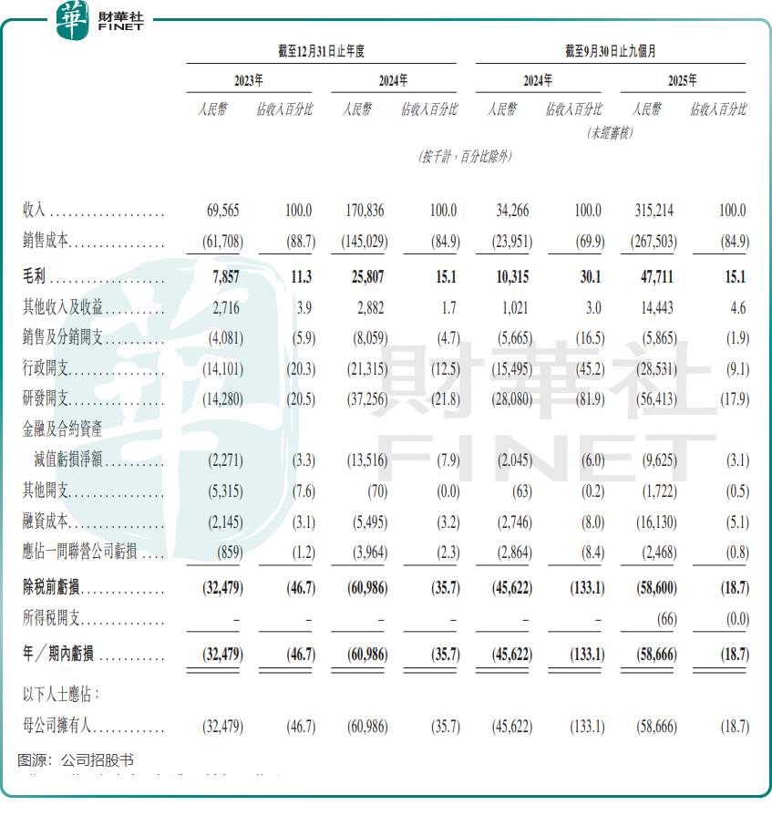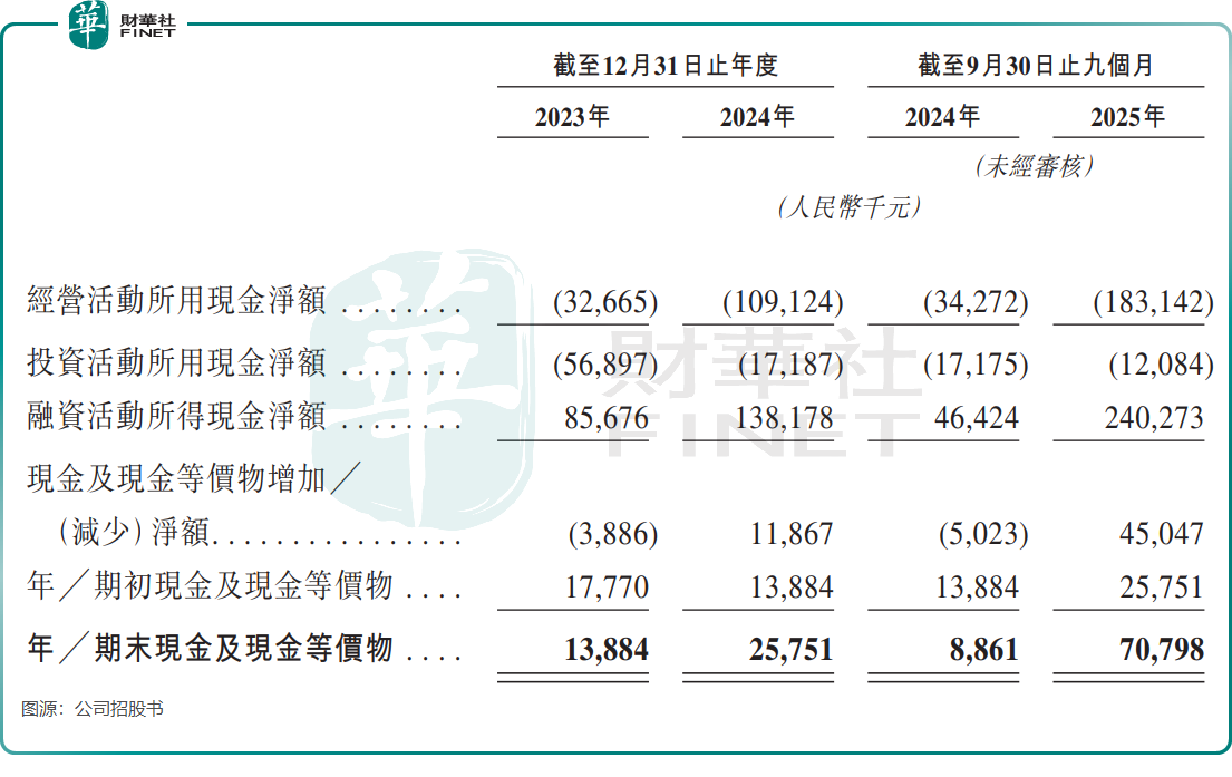 由於處於業務投入期,公司持續產生虧損,2023年淨虧損3247.9萬元,2024年擴大至6098.6萬元,2025年前三季度虧損5866.6萬元。經營現金流同樣承壓,2025年前三季度經營活動所用現金淨額達1.83億元,較上年同期大幅增加。