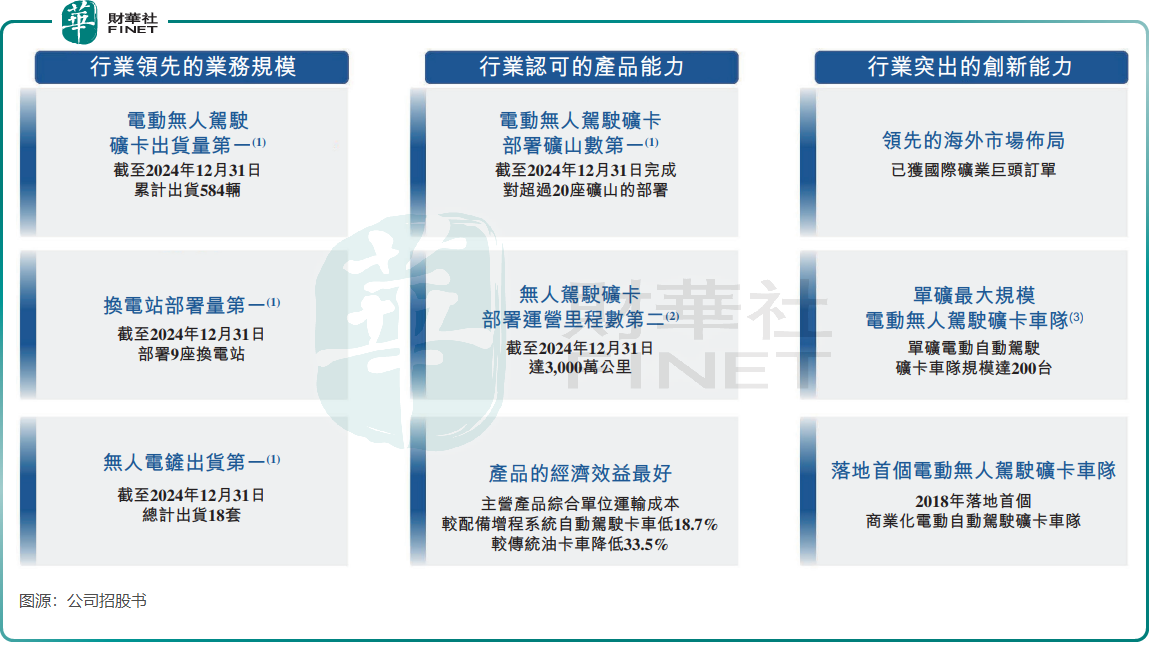 市場地位方面,根據灼識諮詢數據,2024年按出貨量及收入計,伯鐳科技已是全球最大的電動自動駕駛礦卡提供商;截至2024年底,其累計部署礦卡584輛,覆蓋超過20座礦山,換電站部署量及無人電鏟出貨量均位居行業第一。