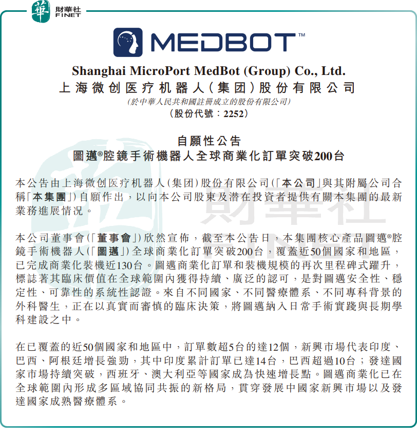 「图迈」訂單突破200台!微創機器人股價大漲11.7%