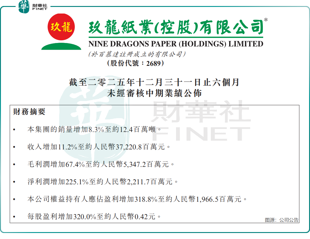 在此背景下,玖龍紙業(02689.HK)、理文造紙(02314.HK)、山鷹國際(600567.SH)等龍頭企業率先受益,其中憑藉「漿紙一體化」深度布局的玖龍紙業,於2月25日交出的2026財年中期(截至2025年12月31日止六個月)業績報告尤為亮眼,成為行業復甦浪潮中的標桿樣本。