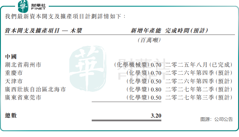 面對行業復甦的戰略機遇期,玖龍紙業展開了野心勃勃的擴產計劃。公司正推進木漿與高端紙品產能布局,在重慶、天津、北海、東莞等地投資建設合計320萬噸木漿產能,而190萬噸的白卡紙和文化紙新增產能已全部於2025年7月至10月期間完成。