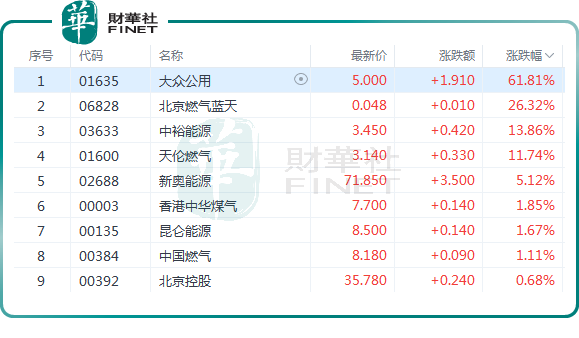 在港股,截至收盤,大眾公用(01635.HK)大漲61.81%,北京燃氣藍天(06828.HK)漲26.32%,中裕能源(03633.HK)漲13.86%,天倫燃氣(01600.HK)漲11.74%,新奧能源(02688.HK)漲5.12%,崑崙能源(00135.HK)、中國燃氣(00384.HK)等亦上行。