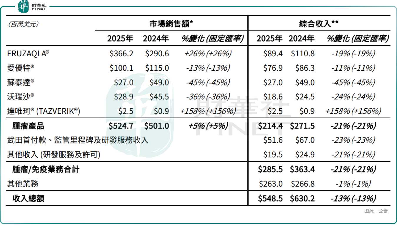 2025年全年,FRUZAQLA®的綜合收入為8940萬美元,同比下降19%,出現了顯著下降。