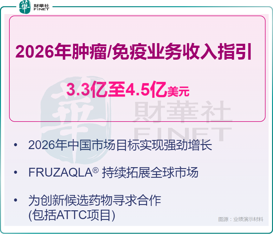 和黃醫藥稱,2026年腫瘤/免疫業務綜合收入的全年指引在3.3億美元至4.5億美元之間,反映了和黃醫藥中國商業營運的持續增長勢頭、FRUZAQLA®在全球範圍內的持續商業擴張,以及創新候選藥物新的合作機會。