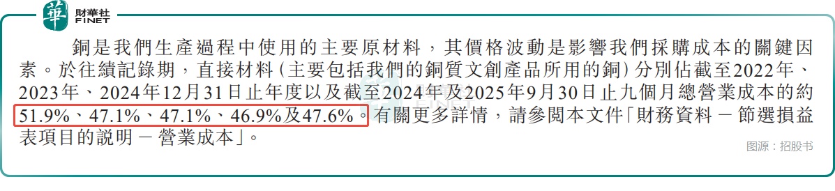 光鮮業績背後,銅師傅也面臨不少經營挑戰。首當其衝的是原材料價格波動風險--銅是公司生產的核心原材料,直接材料成本占營業成本的比例長期維持在47%左右。而近年銅價持續上漲,從2019年的每噸4.76萬元飆升至2024年的7.50萬元,2024年5月更是創下每噸8.86萬元的歷史峰值,截至2025年9月末仍高達每噸8.31萬元。