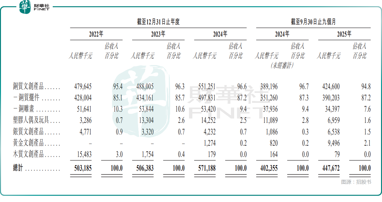 盈利提升的核心驅動力來自核心業務的強勢表現。銅質文創產品是絕對支柱,且收入錄得持續增長,其中於2024年貢獻收入5.51億元,占總營收的96.6%,其中銅質擺件收入4.98億元,占比達87.2%,對這部分業務依賴性較高。與此同時,公司通過生產效率優化、產品組合升級,推動整體毛利率從2022年的32.2%提升至2024年的35.4%,盈利能力持續改善。