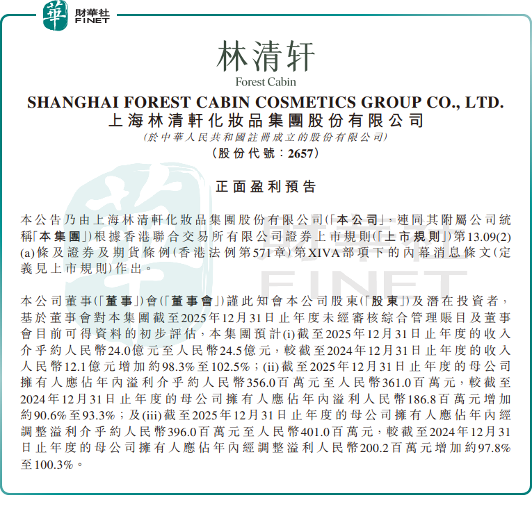 數據顯示,2025年,林清軒預計實現收入介乎24.0億元至24.5億元(單位人民幣,下同),同比增長98.3%至102.5%;歸母淨利潤介乎3.56億元至3.61億元,同比增長90.6%至93.3%;經調整後淨利潤介乎3.96億元至4.01億元,同比增長97.8%至100.3%。