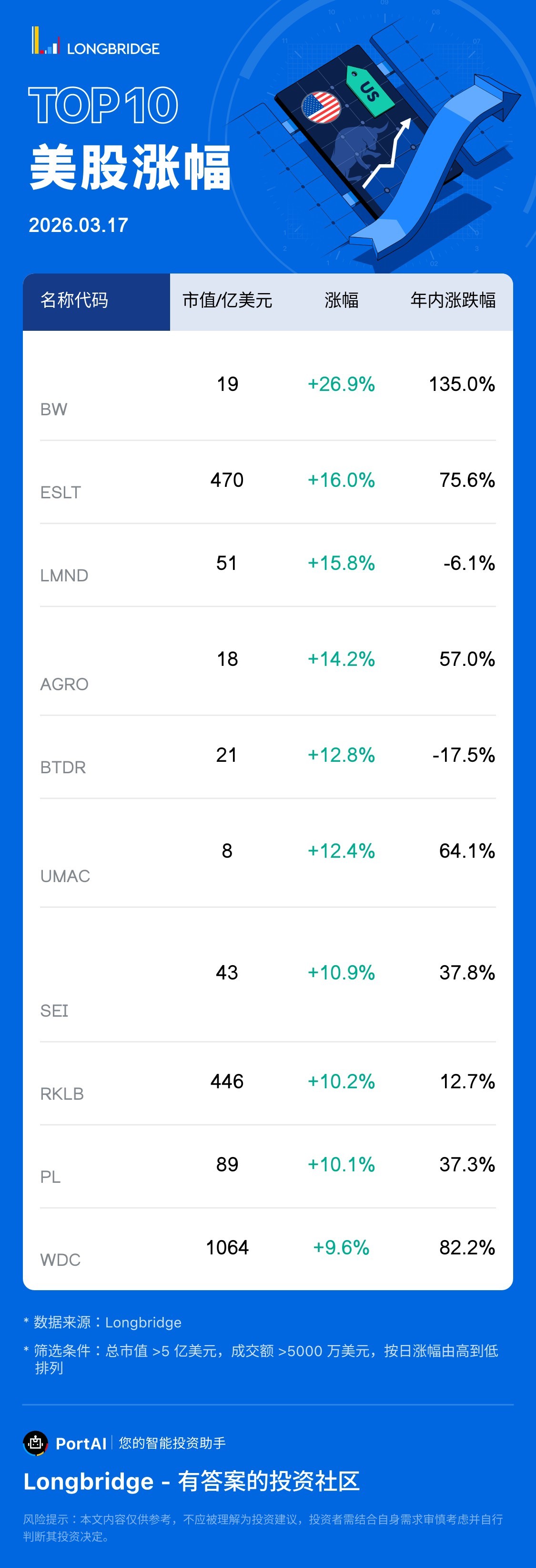 Top 10 美股漲幅(3月17日)