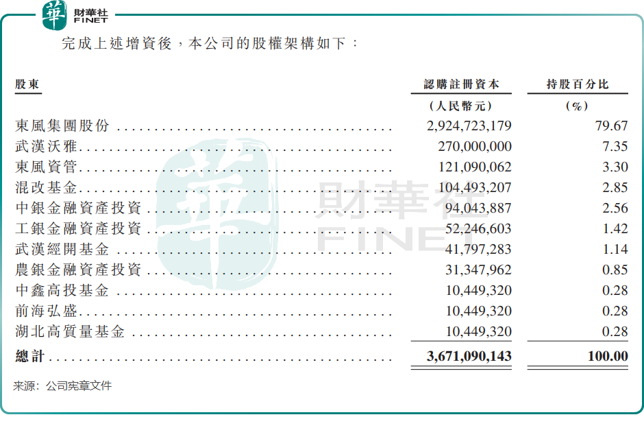 央企底色,是嵐圖汽車最鮮明的標籤。作為東風集團旗下高端新能源品牌,嵐圖與生俱來的央企屬性,讓其擁有了行業內稀缺的低成本融資渠道。招股書顯示,2025年7月完成增資後,東風集團股份持股79.67%,為絕對控股股東;其餘股東包括武漢沃雅企業管理(7.35%)、東風資產管理(3.30%),以及中國國有企業混合所有制改革基金、中銀金融、工銀金融等國資背景投資機構。
