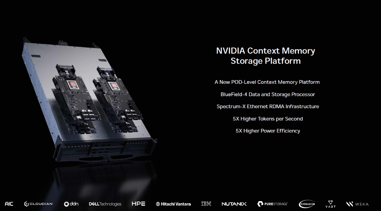 英偉達在 Rubin 結構中新增 “推理上下文存儲平臺”(ICMS 平臺):新增的 ICMS 專用上下文存儲,將 KV Cache 從 HBM 下沉至更具性價比的存儲介質,釋放 HBM 帶寬用於計算,從而實現推理階段的降本。