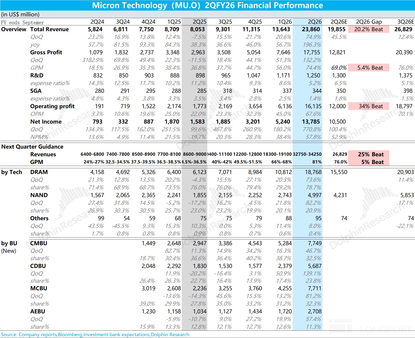 1.整體業績:美光本季度營收 238.6 億美元,環比增長 75%,好於上調後的買方預期(199 億美元),本季度收入增長主要來自於 DRAM 和 NAND 業務的雙重帶動,兩大業務環增都在 70% 以上。