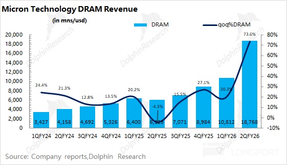 DRAM 是公司最大的收入來源,佔比接近 8 成。而本季度公司 DRAM 業務收入增長至 187.7 億美元,環比增長 74%。其中本季度 DRAM 均價環比大幅提升 65% 左右,出貨量也有 5% 左右的環比增長。