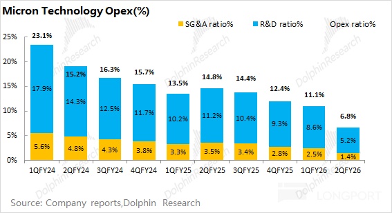 美光公司 2026 財年第二季度經營費用 16.2 億美元,環比增長 7.3%。由於收入端增速更快,公司本季度經營費用率下降至 6.8%。