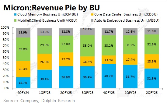 此外,美光公司在之前調整了披露口徑(面向於下游各市場的收入情況),將原來的 CNBU、SBU、MBU 和 EBU 重新劃分爲CMBU、CDBU、MCBU 和 AEBU 四類。當前數據中心及雲業務的佔比已經達到 50% 以上,業務口徑調整也凸顯了公司對相關業務的重視