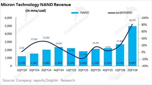 NAND 是公司第二大收入來源,佔比約爲 20%。本季度公司 NAND 業務收入爲 50 億美元,環比增長 82%。其中本季度 NAND 出貨量環比微增 2%,但產品均價環比大幅增長 78% 左右。