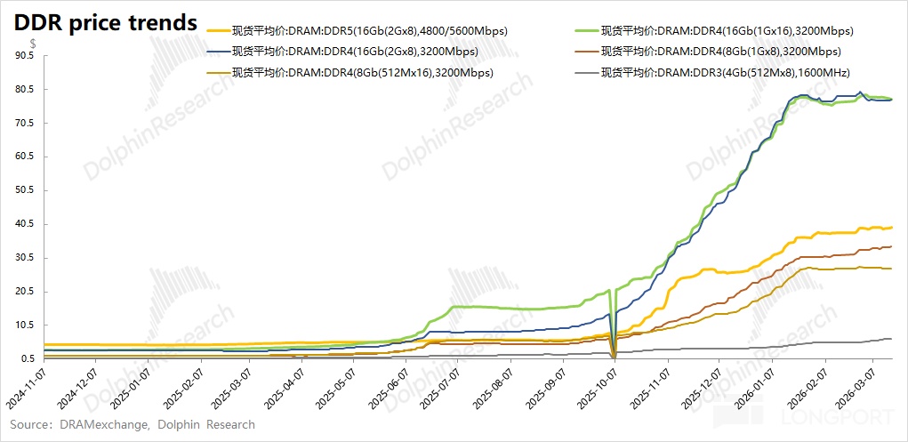 a)傳統存儲的大週期:美光將近 8 成的收入來自於 DRAM 業務,其中大部分來自於非 HBM 的 DRAM 產品貢獻。DDR 產品價格的大幅上漲,對公司業績帶動更爲明顯,當前仍處在全面漲價的大週期之中。