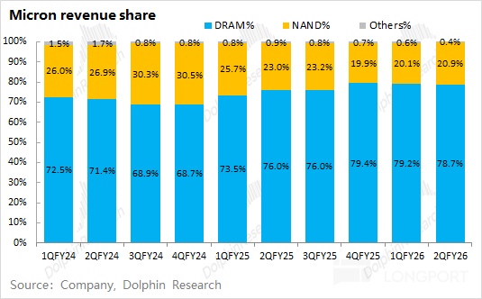 從最新的財報看, DRAM 和 NAND 仍然是公司最重要的收入來源,其中 DRAM 的收入佔比維持在 8 成左右。