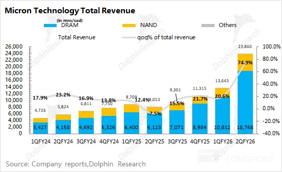 美光公司 2026 財年第二季度總營收爲 238.6 億美元,環比增長 75%,好於市場預期(199 億美元)。本季度的收入環增,來自於 DRAM 和 NAND 的雙雙推動。