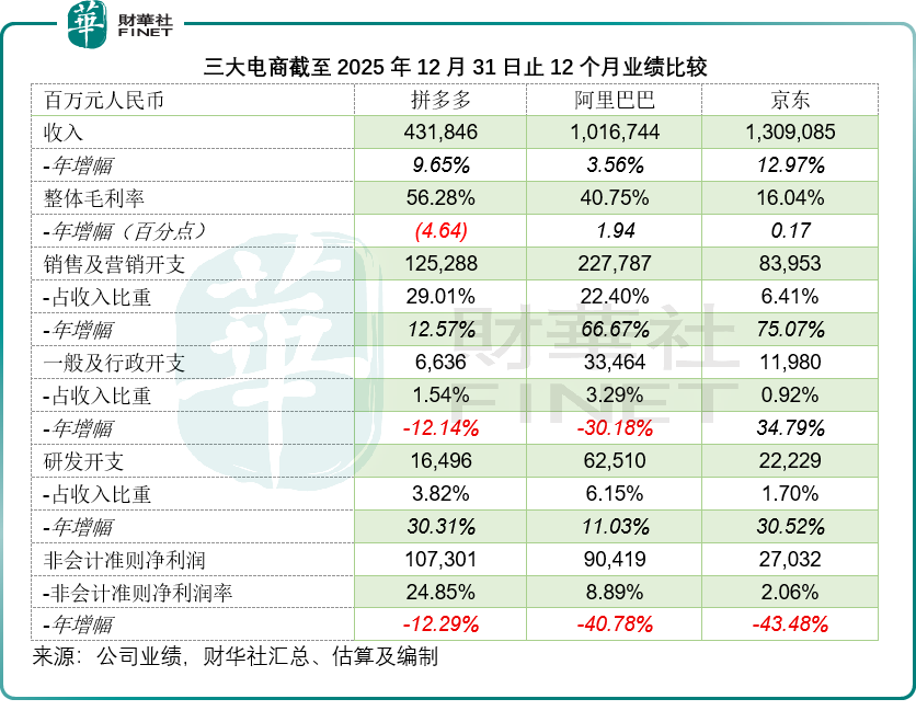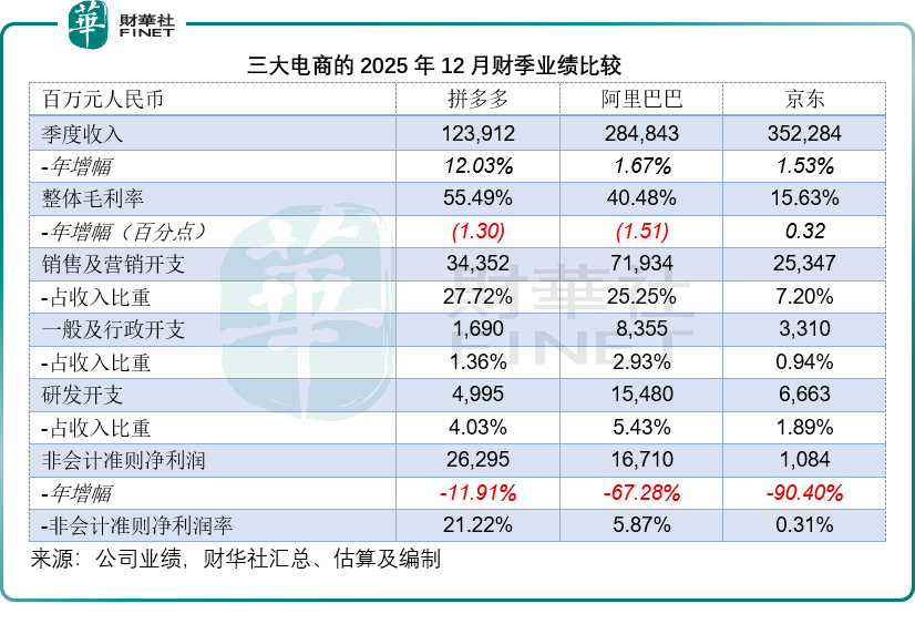 中國電商行業正式邁入存量競爭深水區。當用戶紅利和流量增量雙雙觸及天花板,三家平台頭部玩家--拼多多(PDD.US)、阿里巴巴(09988.HK)與京東(09618.HK),公布了表現各有差異的2025年12月財季答卷。