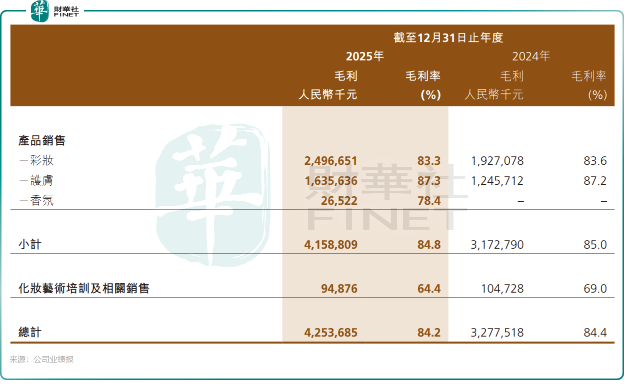 2025年,毛戈平的毛利率達84.2%,淨利率也提升至23.9%。這是一個什麼概念?對比來看,這一毛利率水平不僅顯著高於珀萊雅(603605.SH)、上美股份(02145.HK)等國貨同行,甚至已逼近或超過部分國際一線奢侈品美妝品牌。