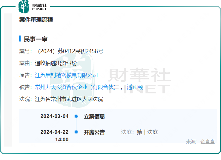 更令人側目的是,微億智造的法定代表人、執行董事兼COO潘正頤,在2024年3月因「追收抽逃出資糾紛」被江蘇啟釗精密模具有限公司(已註銷)告上法庭,另一個被告則是常州力天投資合夥企業(有限合夥)。而常州力天與潘正頤正是原告當時僅有的兩大股東,持股比例分別為60%和40%。