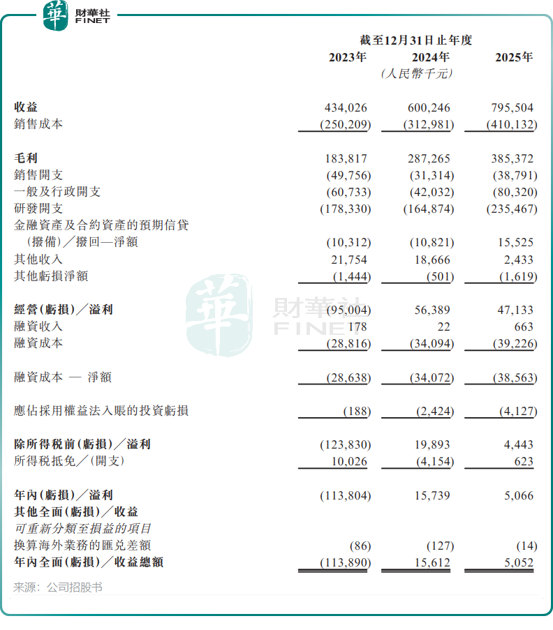 招股書顯示,公司收益從2023年的4.34億元增長至2025年的7.96億元,複合年增長率高達35.4%。但盈利能力卻起伏不定,2023年淨虧損1.14億元,2024年扭虧為盈至1573.9萬元,2025年盈利又回落至506.6萬元,幾乎在盈虧平衡線上掙扎。