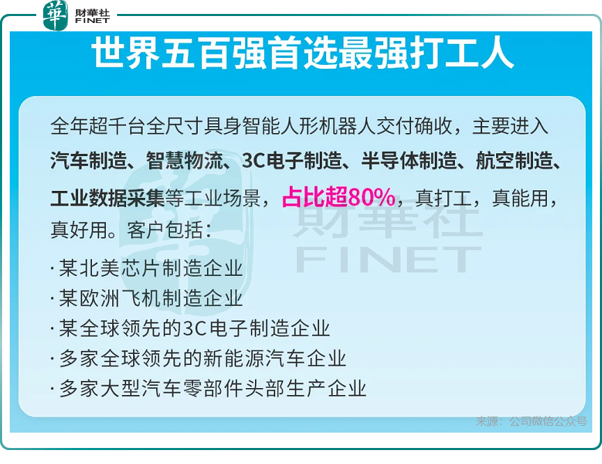 公司披露的數據顯示,全年超千台全尺寸具身智能人形機器人交付確收,超過80%進入了汽車製造、智慧物流、3C電子製造、半導體製造等工業場景。其客戶名單堪稱「全球工業明星隊」:某北美芯片製造企業、某歐洲飛機製造企業、某全球領先的3C電子製造企業、多家全球領先的新能源汽車企業、多家大型汽車零部件頭部生產企業。
