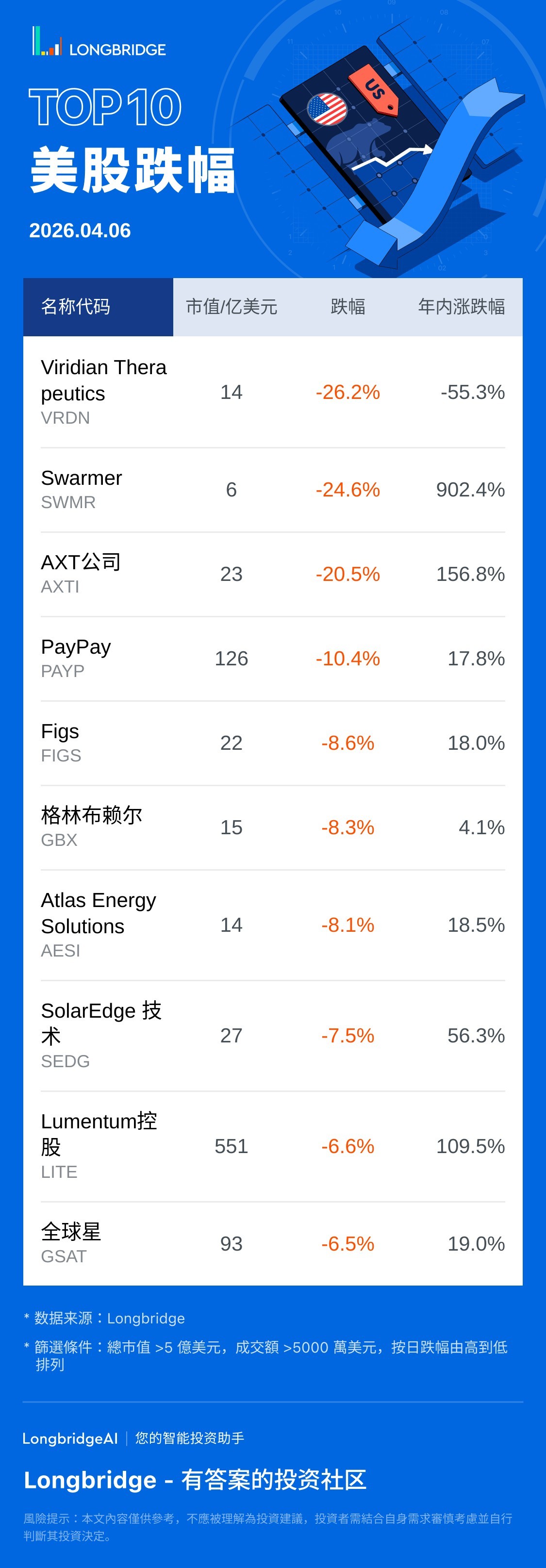 Viridian Therapeutics(VRDN) 跌 26.22%,成交額 2.1 億美元,年內累計跌 55.3%。