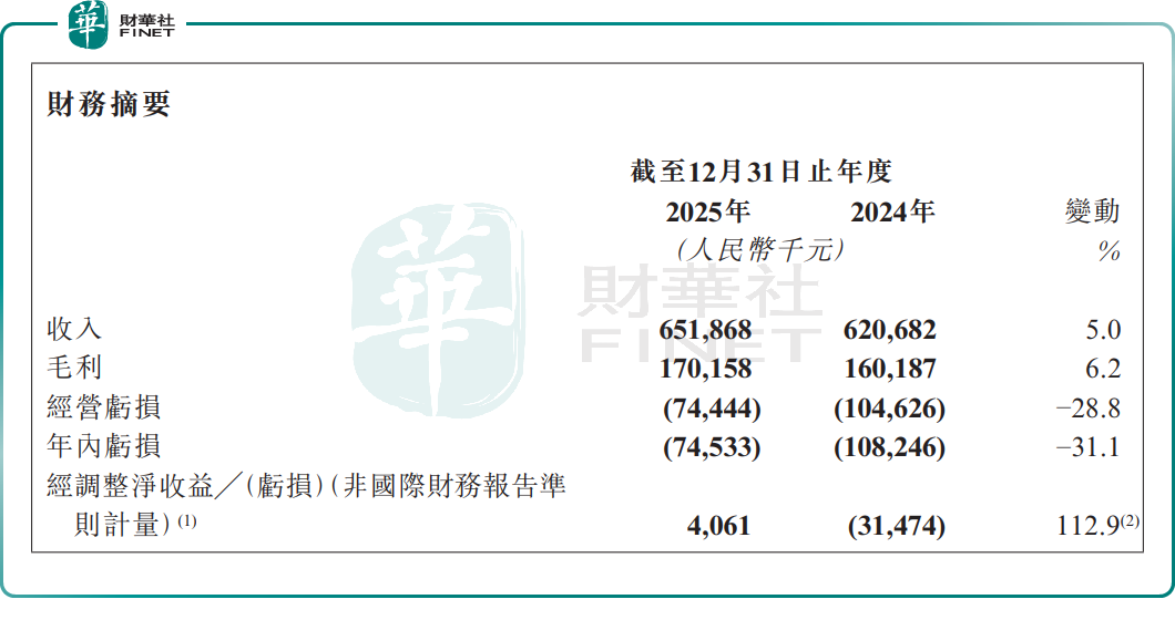 財報顯示,2025年,健康160收入為6.52億元(單位人民幣,下同),同比增長5.0%;受上市相關一次性費用等因素影響,公司年內虧損7453.3萬元,但虧損同比收窄約31.1%。公司經調整收益約406.1萬元,實現扭虧為盈。