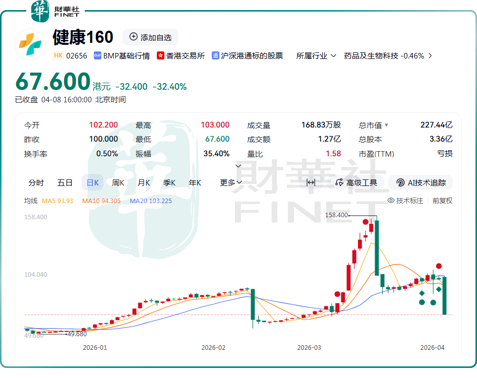 4月8日,國內最大的掛號平台--健康160(02656.HK)迎來大幅震盪,收盤暴跌32.4%,報67.6港元/股,讓本就脆弱的市場情緒再遭衝擊。