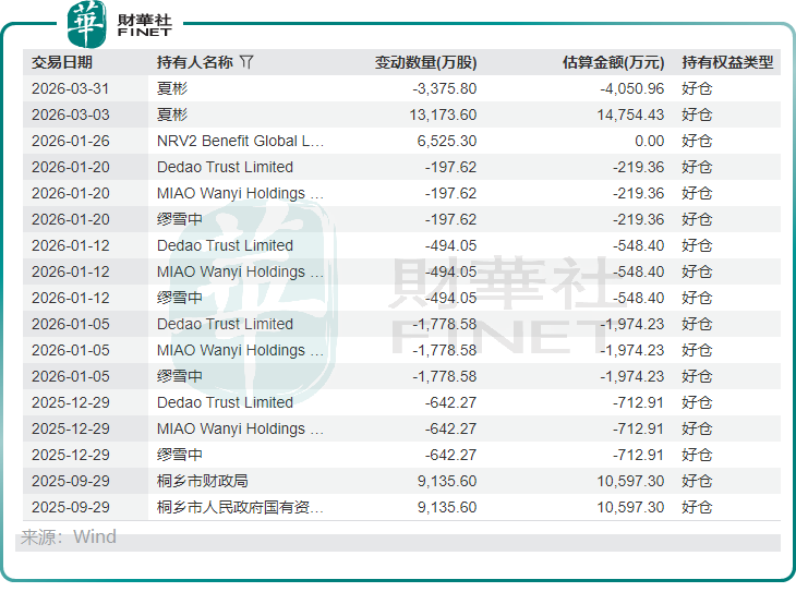 Wind數據顯示,公司董事會主席、執行董事、首席執行官繆雪中自2025年12月底至2026年1月20日進行了四次股份減持,累計減持超3100萬股,套現超過3400萬港元。最後一次套現後,繆雪中持有公司股權比例為70.45%,仍牢牢掌握著公司控股權。