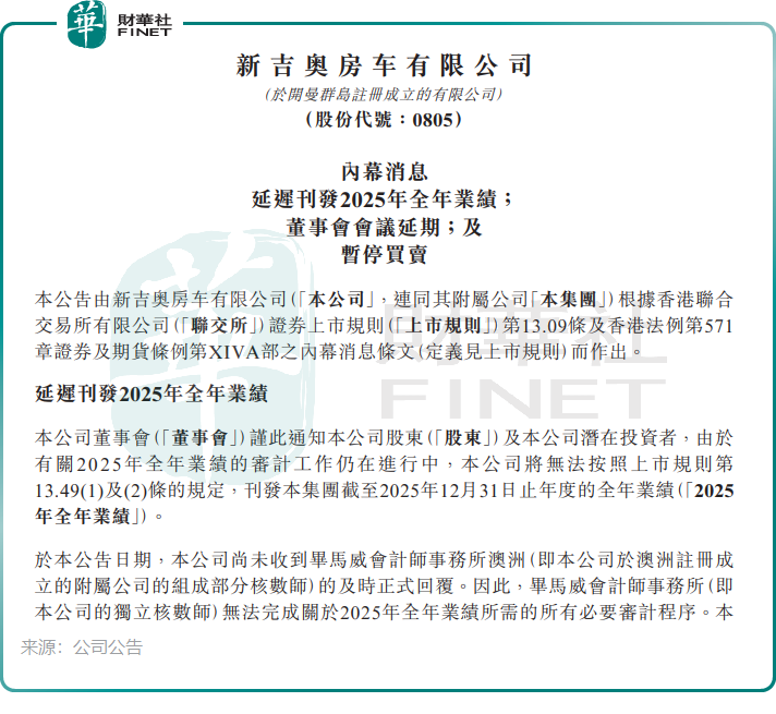 3月31日,新吉奧房車公告稱,「由於有關2025年全年業績的審計工作仍在進行中」,公司將無法按規定刊發全年業績,股份預計將於4月1日上午9時起暫停買賣。