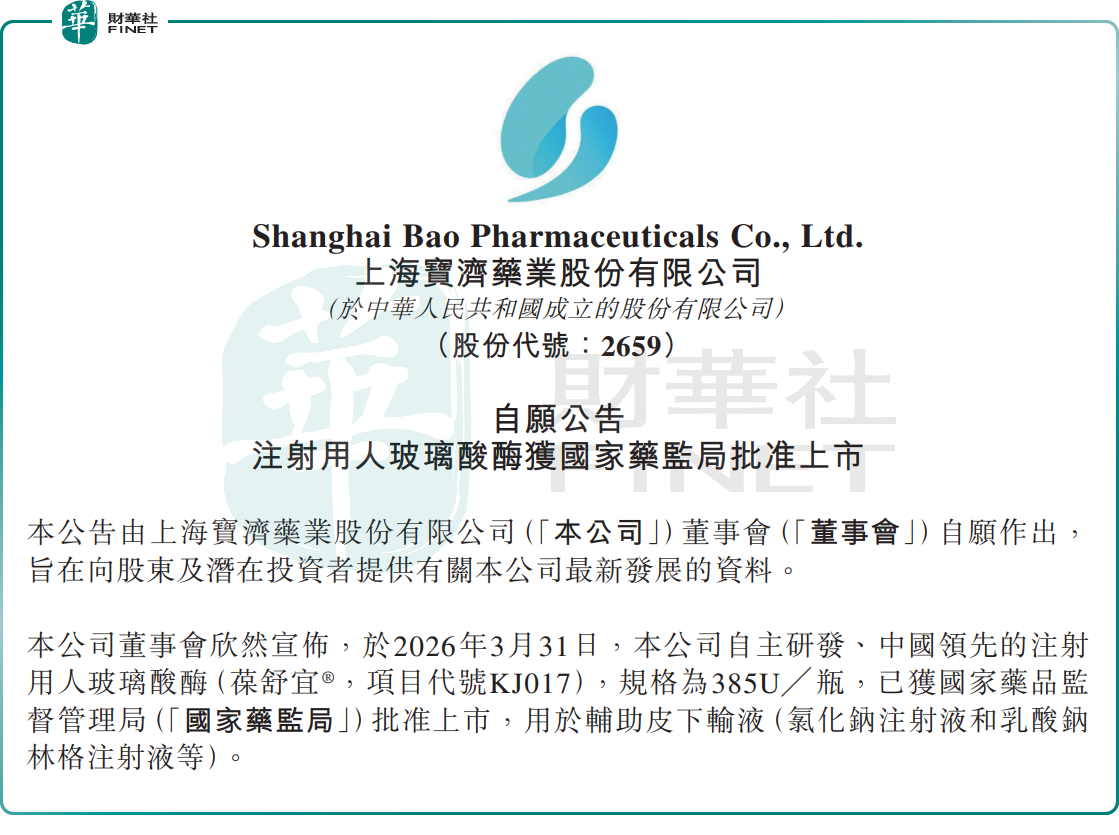 4月8日,寶濟藥業發布公告稱,於2026年3月31日,公司自主研發、中國領先的注射用人玻璃酸酶(葆舒宜,項目代號KJ017),規格為385U╱瓶,已獲國家藥監局批准上市,用於輔助皮下輸液(氯化鈉注射液和乳酸鈉林格注射液等)。