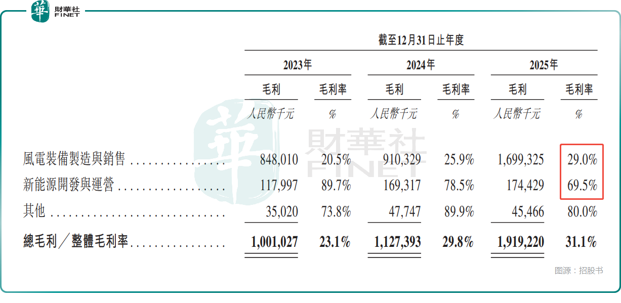 從業務結構來看,風電裝備製造與銷售還是大金重工的絕對核心,其2023年至2025年的收入占比分別為95.9%、92.9%、95.0%,其中2025年的毛利率增至29.0%,而新能源開發與運營的收入占比分別為3.0%、5.7%、4.1%,2025年的毛利率降至69.5%。