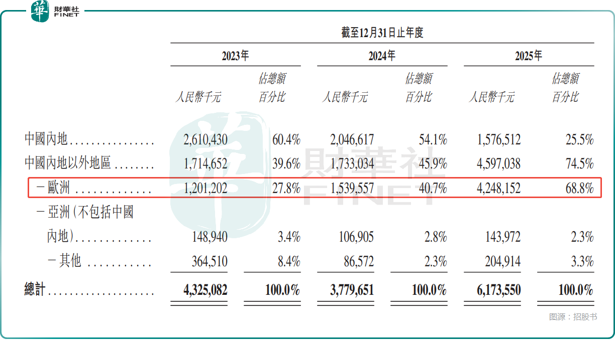 分區域來看,2023年至2025年期間,來自中國內地的收入占比從60.4%持續降至25.5%,而中國內地以外地區的收入占比從39.6%提升至74.5%,其中歐洲貢獻的收入占比從27.8%飆升至68.8%。