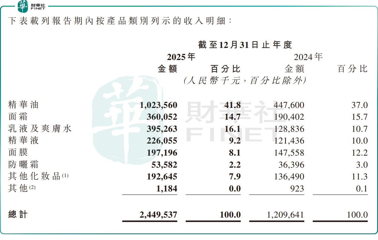 其次,林清軒「大單品依賴症」始終存在,第二增長曲線尚未形成。按產品類別看,該公司核心單品「山茶花修護精華油」2025年收入貢獻比重提升至41.8%,近乎撐起了公司業績的半壁江山。這種單一品類主導的經營模式暗藏風險,一旦精華油市場出現技術迭代、消費趨勢轉變,或是面臨同類產品的激烈競爭,公司業績將直接受到衝擊。