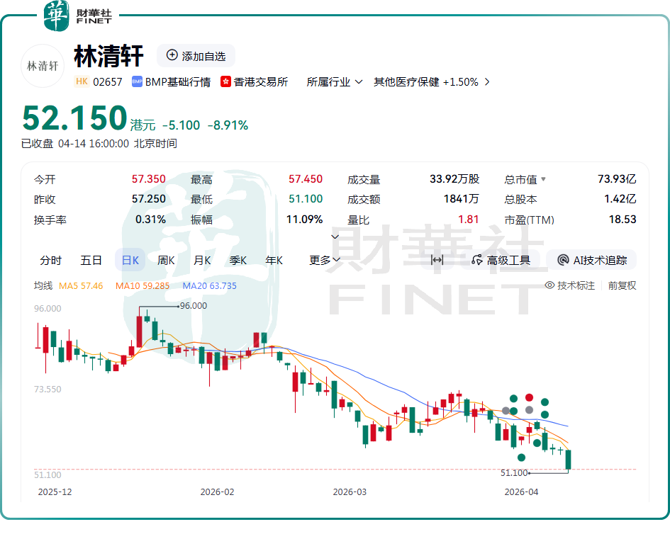 4月14日,「國貨高端護膚第一股」林清軒(02657.HK)股價延續下行態勢,盤中一度下探至51.1港元,創上市以來新低;截至收盤,該股跌幅為8.91%,報52.15港元/股。