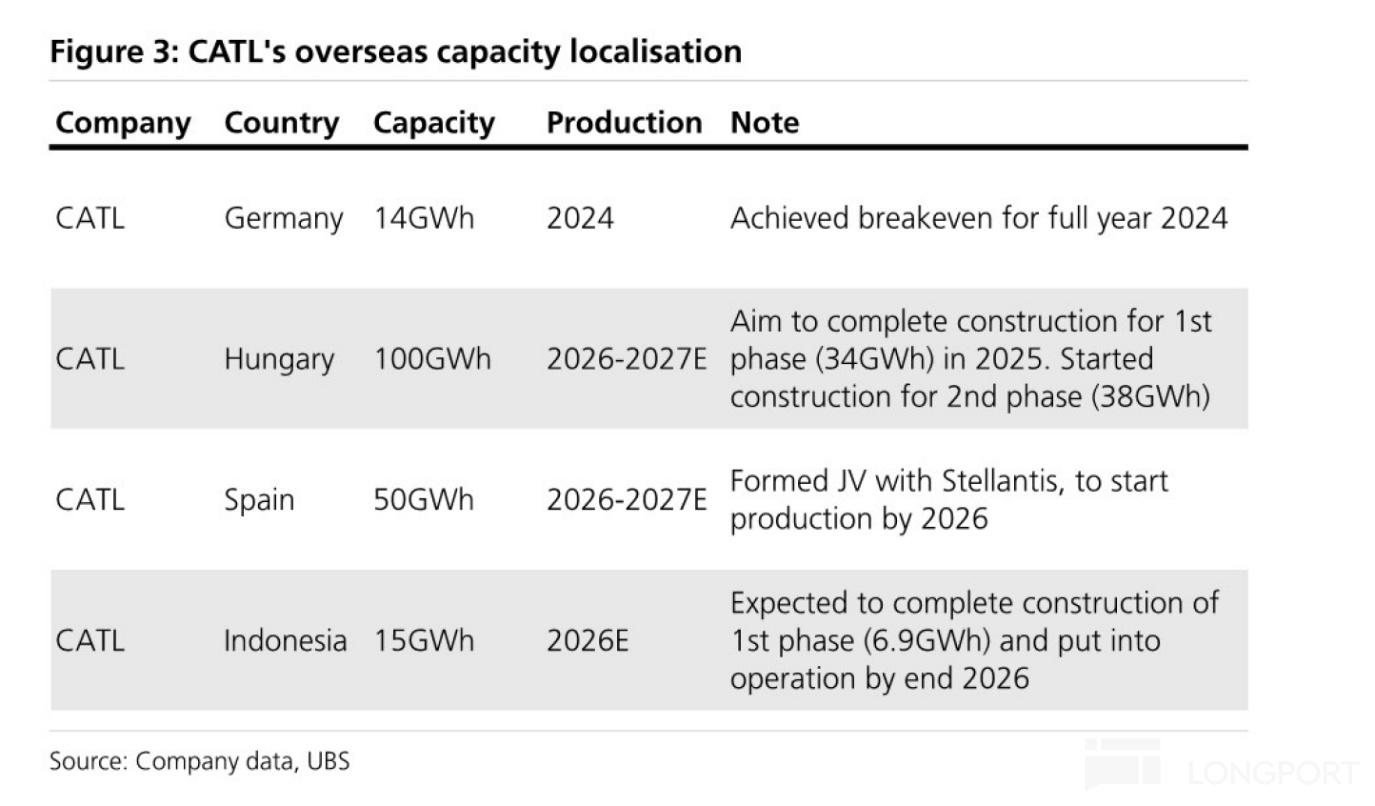 歐洲:德國工廠(14GWh)已於24年投產並實現穩定盈利;匈牙利工廠(規劃100GWh)的一期項目(34GWh)電芯產線設備已進場調試,預計2025年底建成;西班牙工廠(規劃60GWh)已完成前期審批併成立合資公司,即將在2026年正式啓動籌建。