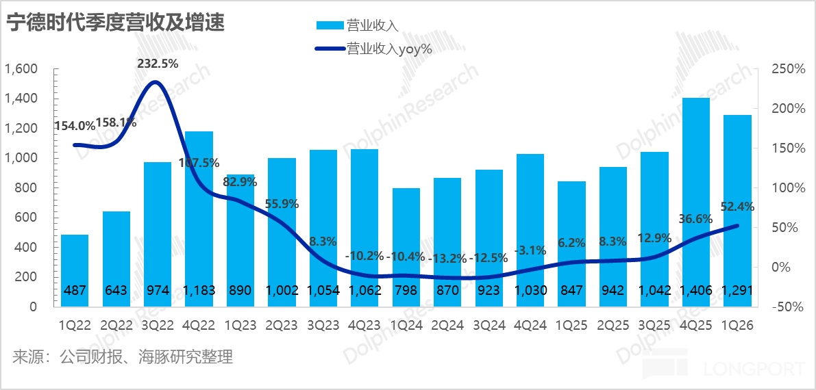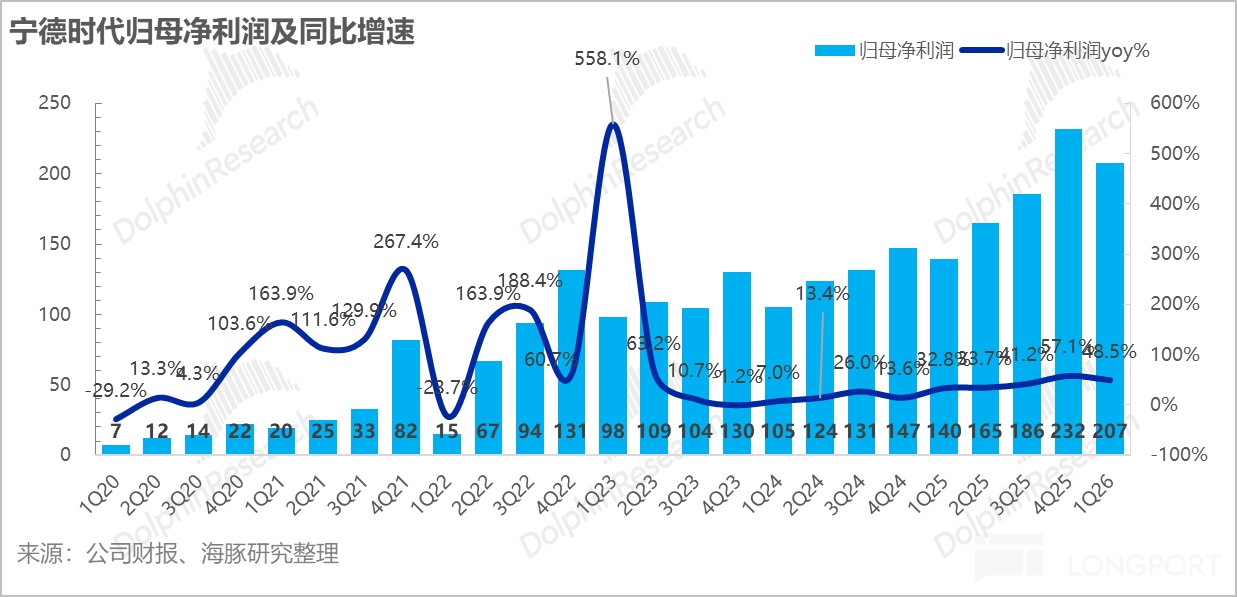 在面臨上游原材料反彈、傳統淡季及政策擾動等多重逆風的“極限測試”下,公司依然交出了雙超預期的成績單。這不僅徹底擊碎了此前市場關於“原材料漲價將侵蝕利潤”的悲觀僞命題,更印證了海豚君在《寧王:產能拉滿!AI 基建時代霸氣歸來》中強調的核心觀點:在鋰電全面上行的“黃金週期”裏,寧王憑藉其深厚的成本護城河與議價權,擁有極高的業績確定性與爆發力。