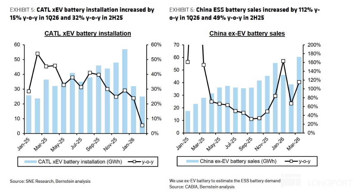 一季度公司動力電池出貨約150GWh,同比增速高達56%;同期國內新能源車銷量增速僅爲-4%。兩者之間形成了巨大的“增速剪刀差”,也進一步驗證了“單車帶電量提升與結構化增量”的邏輯正在兌現。