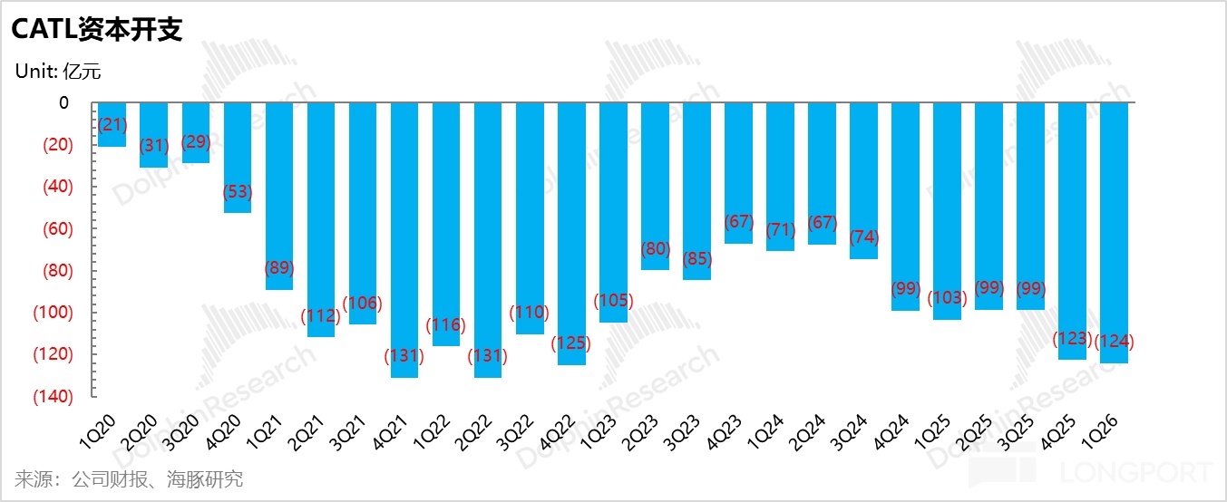 從資本開支的週期律來看,寧德時代正迎來新一輪的擴張拐點。雖然公司在2021-2022年經歷了產能的密集投入期,隨後因行業階段性供需錯配,資本開支自2022年Q1起進入下行週期(並在2023年Q1觸及約67億元的階段性低點)。但自2024年Q1起,公司的資本支出已開始築底回升。本季度,資本開支更是加速攀升至約124億元,逼近上一輪擴產巔峯期的水平,釋放出極強的擴張信號。