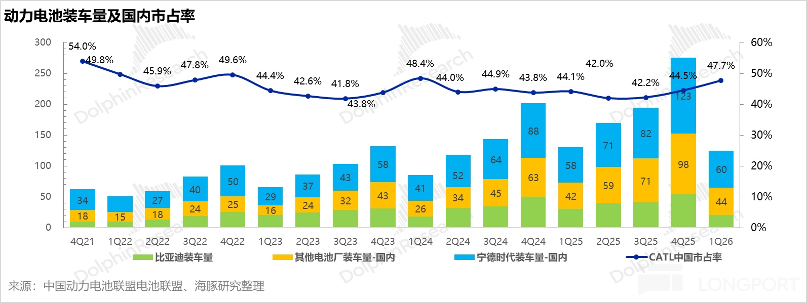 國內份額持續擠壓對手: 一季度寧德時代國內市佔率環比繼續提升3.2個百分點至47.7%;若剔除比亞迪(主要自供),其在第三方市場的市佔率環比上行1.8個百分點至57.3%。