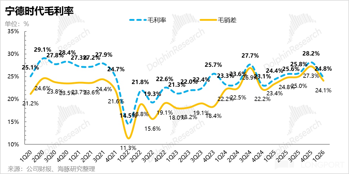 1Q26公司毛利率爲24.8%,單Wh毛利從去年四季度的0.18元/Wh下滑至約0.16元/Wh。雖然相比去年四季度產能滿載時的高點(毛利率28.2%)有所回落,但整體表現與市場預期持平,展現了極其穩健的盈利韌性。