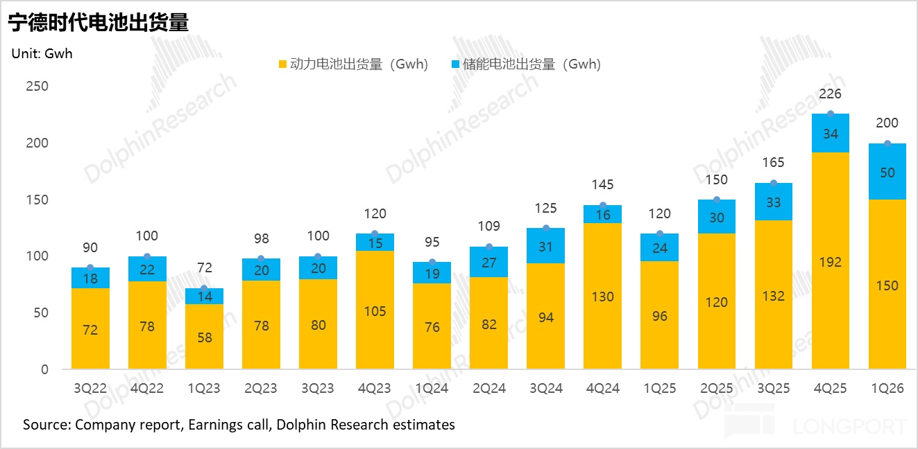 綜合考量公司產能週期的重新擴張、海外(尤其是歐洲)產能的加速爬坡以及全球儲能市場的爆發,海豚君進一步上調2026年寧德時代電池總出貨量預期至 950GWh(同比增長44%)。具體出貨結構與核心驅動如下:
