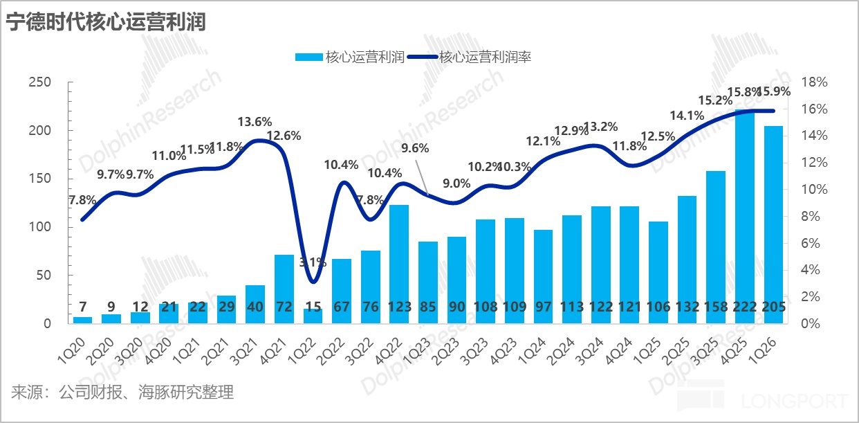 而海豚君更關注的核心運營利潤率趨勢(毛利率-三費-資產/信用減值損失率),一季度205億元,同比增速高達94%,核心運營利潤率也達到15.9%,環比與上季度持平,也表明寧王持續穩健的經營能力。