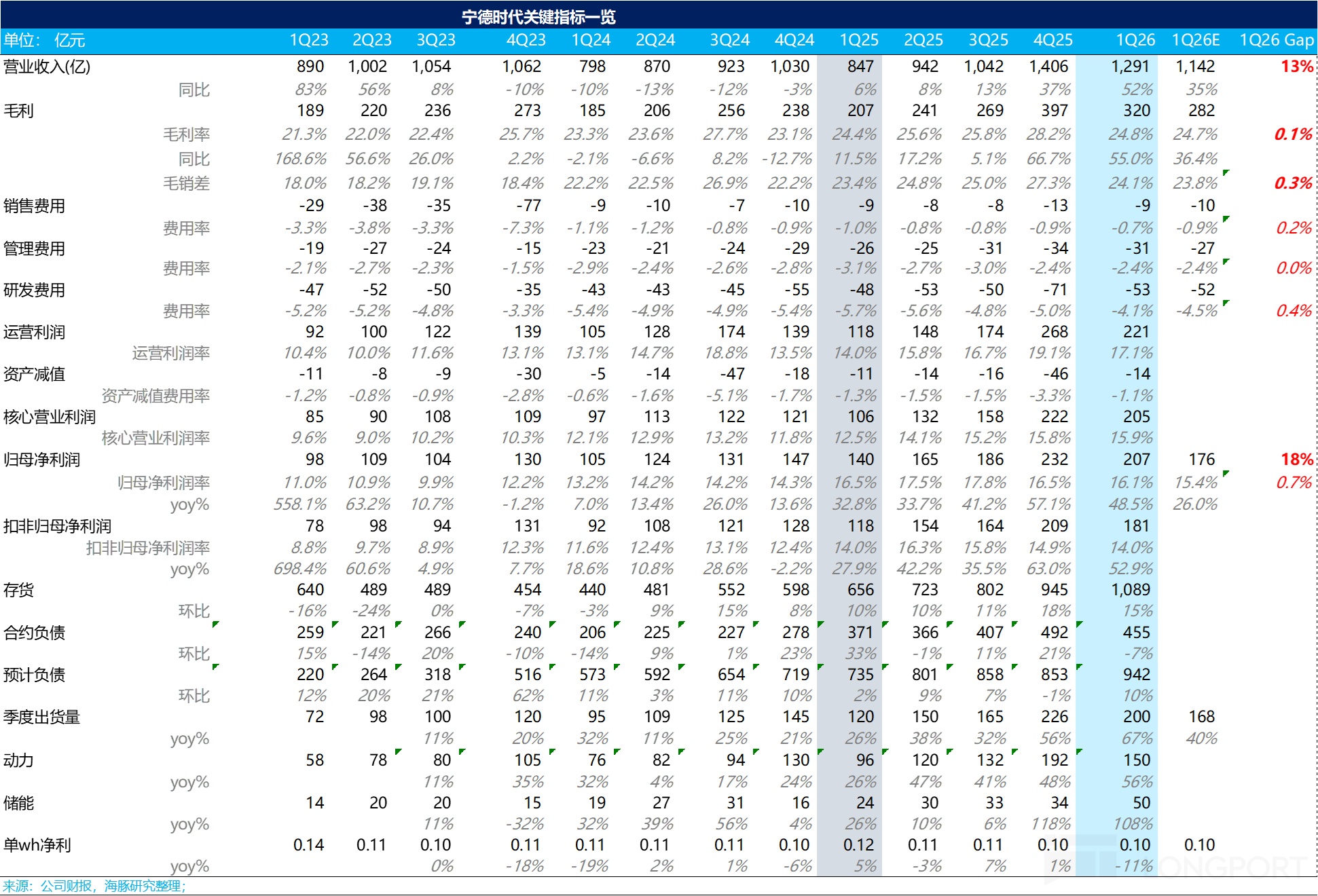 2026年一季度單季收入1291億元,同比大幅增長52%,再次驗證鋰電上行週期啓動,並大幅超出市場預期1142億。超預期的核心在於出貨量繼續高增,以及在上游原材料漲價背景下,公司憑藉強大的議價能力順利將成本傳導至下游,帶動了銷售單價提升。
