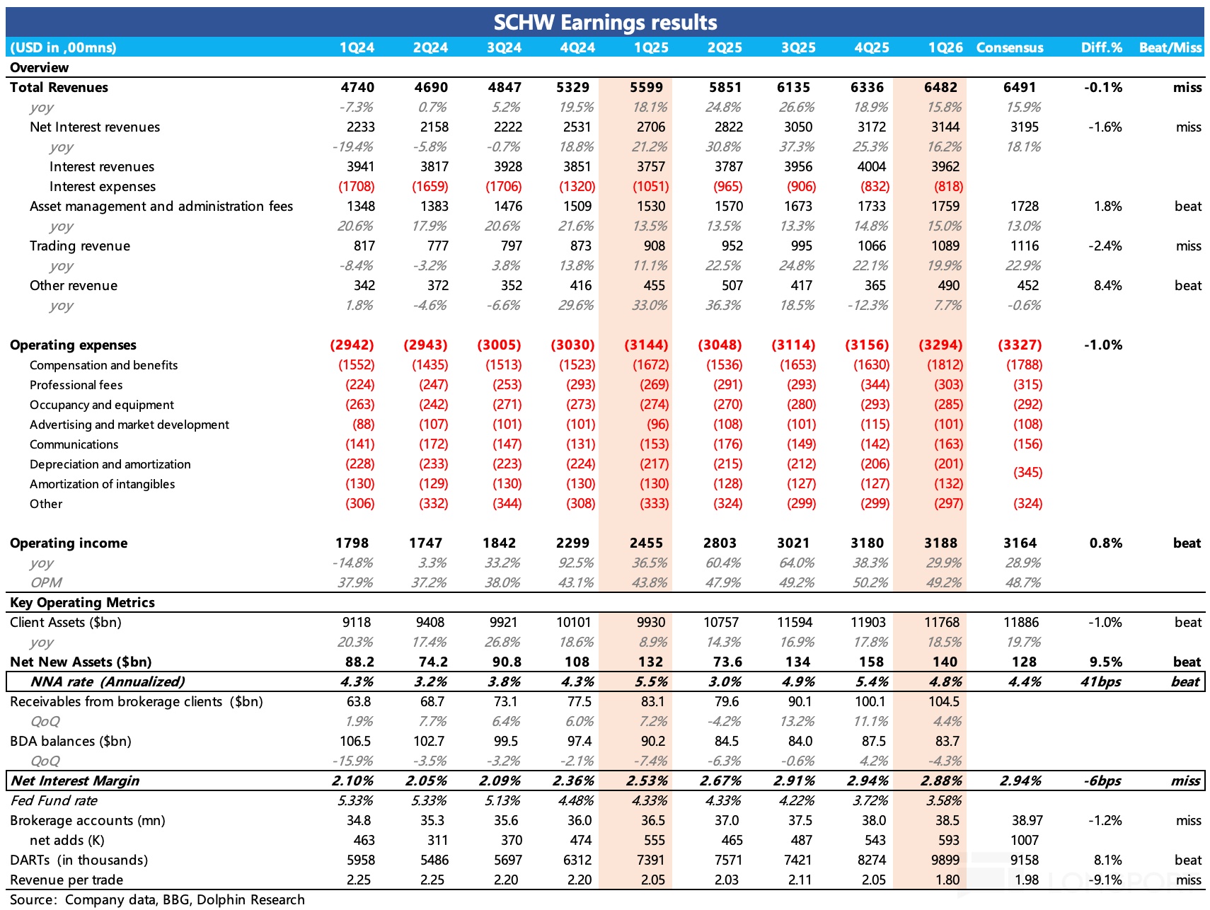 $嘉信理財(SCHW.US) 一季度業績其實本身還可以,但市場預期相對飽滿,可能會介意收入略微 miss 的表現,以及息差收益率(NIM)環比下降的瑕疵。
