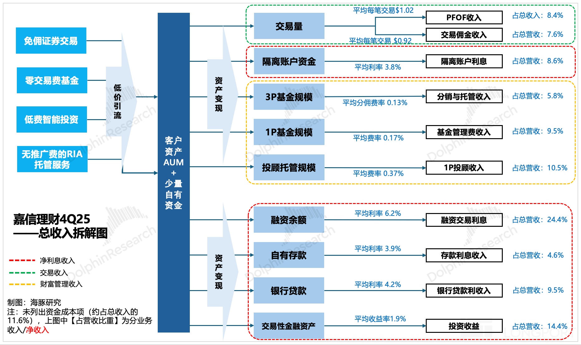 在交易、基金降傭的大趨勢下,嘉信依靠存貸息差、投資固收類的金融資產帶來的利息收益,彌補了交易收入的缺口。從集團整體來看,商業模式逐步定型——通過免佣金的證券交易,低通道費、零交易費的基金申贖,低諮詢費的智能投資以及無推廣費的獨立 RIA 託管服務來引流,壯大整體客戶資產規模(AUM)後,最終以資產生息(存、貸款利息/投資收益)爲主的創收模式。