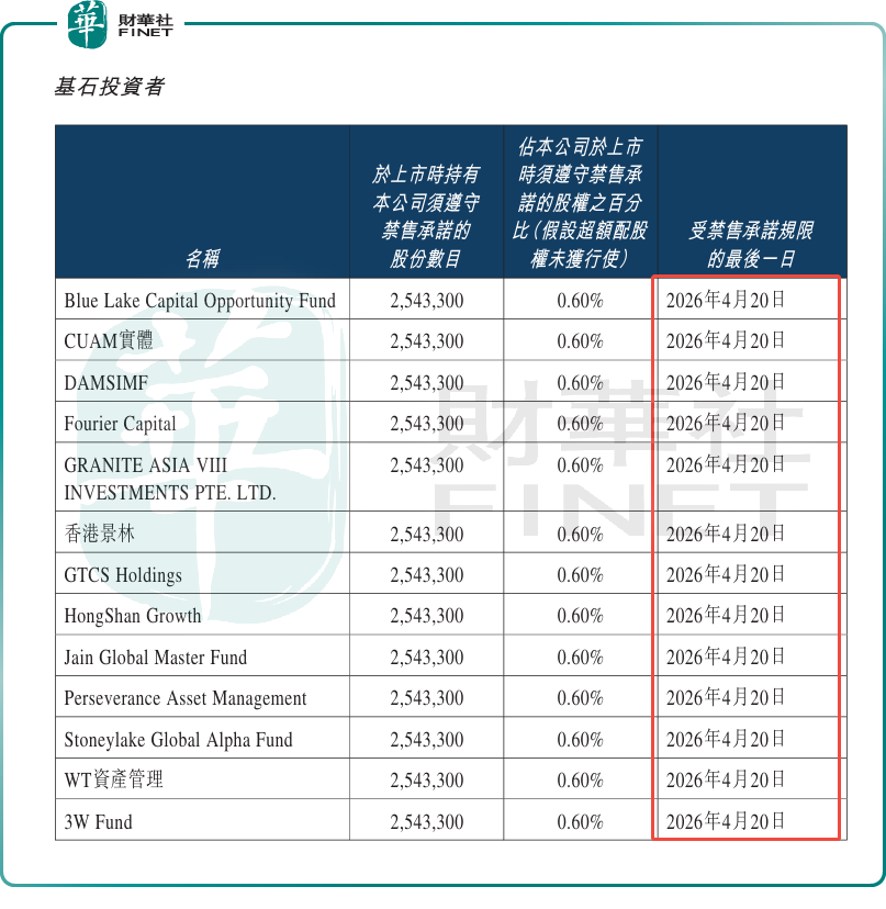 但13名基石投資者最後禁售日期均為4月20日,合計約3306.29萬股解禁,占已發行股本的7.8%。按照現價19.2港元/股計算,單單基石投資者解禁市值高達6.35億元。解禁後相關股東是否存在減持套現的動力,將對短期股價構成不容忽視的拋售壓力。